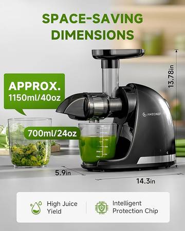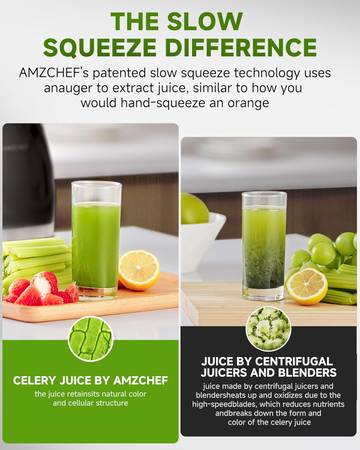 • 【Small Caliber Slow Juicer】AMZCHEF cold press juicer with small feeder chute allows you can remove the seeds when you cutting the fruit to reduce the bitter taste, It can maintain the flavor of fruits. At the same time,juicer slow masticating can prevent children from bring injured during juicing.This humanized design can let you and your whole family make each other's favorite juice with AMZCHEF slow masticating juicer together every moring.