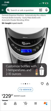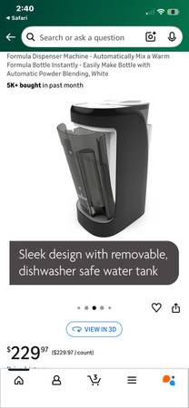 Really nice and useful automatic bottle maker, you can choose three different temps and choose from 2-10 ounces. Works with every formula type & bottle. Doesn’t come with box or instructions but easy to put together and it has a website for figuring out how to work it. Comes with everything - water tank, formula holder, funnel, bottle stand, everything. No issues, works like new - just getting rid of it since my kid is off formula. Originally paid $200 for it.
