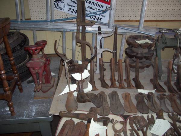 large 55 piece lot of vintage cobbler tools .. from lasts to leather stretchers and shoe stretchers to star nail bins, etc. ! a very nice assemblage of vintage accoutrements -- sold as a lot. can see/buy anytime .. just message to arrange . am easy to find in greensburg - about a block from the courthouse... this is a large and very nice grouping ..