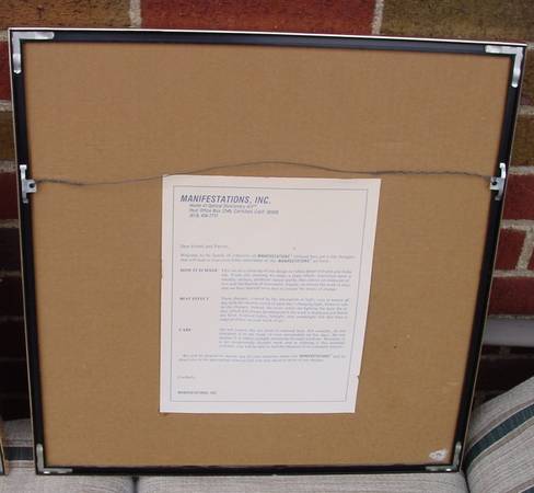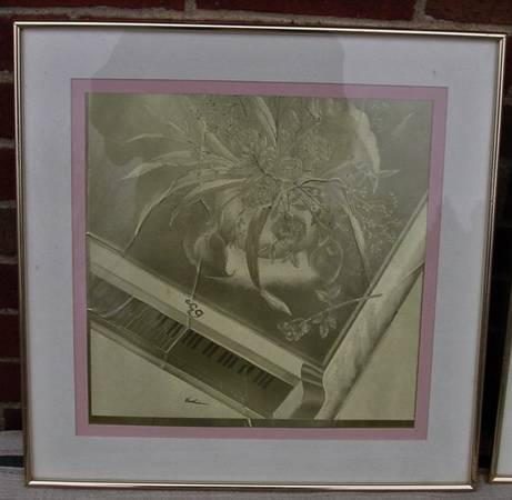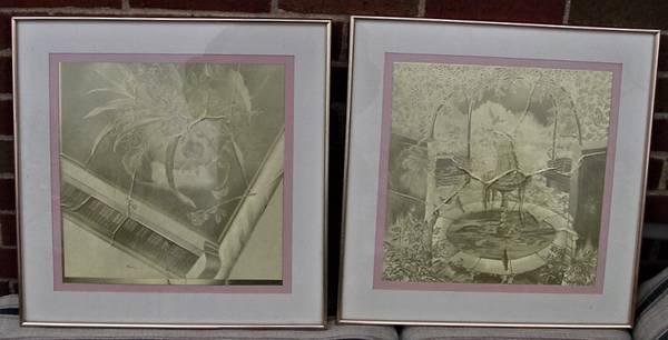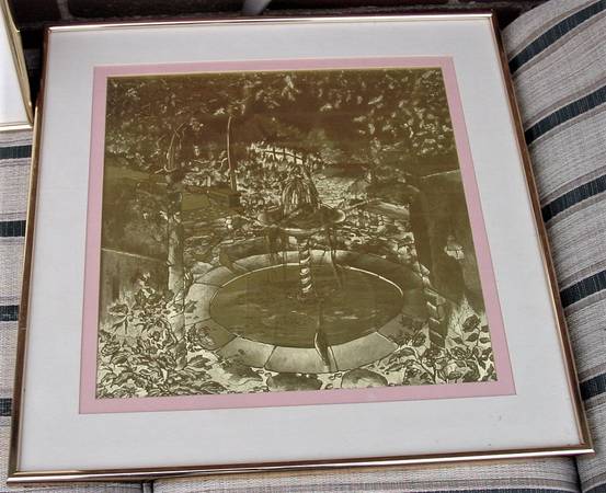2 Optical Illusion Gold Foil Art Pictures in Gold Frames Manifestation Inc. This is a beautiful picture. Changes with the direction you look at it. 18 2/10" x 18 2/10". Made by Manifestations International, Inc. in Carlsbad, CA. One picture is a Picture of a Piano Keyboard and a Flower Plant. The 2nd Picture is a Outdoor Fountain with Birds and Trees. $10 each or Both for $15. From a Smoke Free and Pet Free Home.