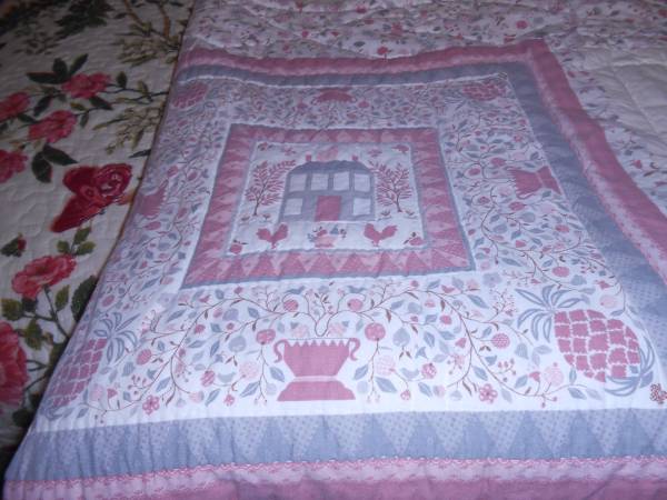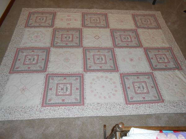 Hand made quilt , Like New. It has soft shades of pink, rose and a little gray , the blocks are embroidery and candle wicking with other blocks of houses. Measures 72 inches X 91 inches. If you are reading this I still have it. Asking $150..