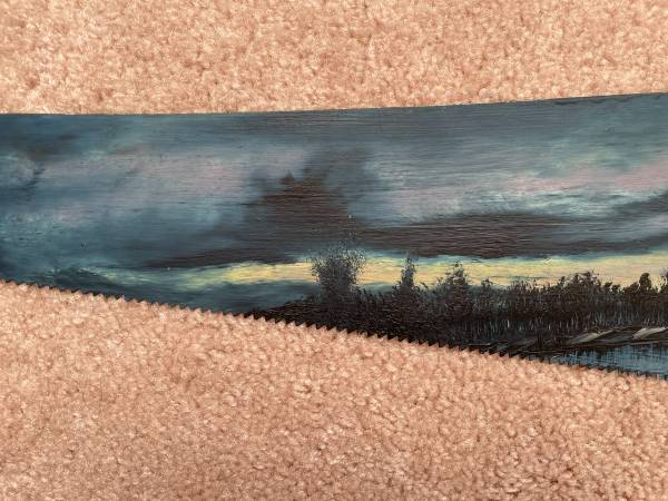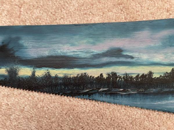 As you can see, this oil painting was done on a very old saw. This is one of the saws that belonged to my Dad who was quite the carpenter. He actually built our house back in the 1940's. I wanted to preserve at least one of his saws and I felt the best way to do that was to create a painting on it. After all, who would want to destroy a saw with a beautiful oil painting on it!