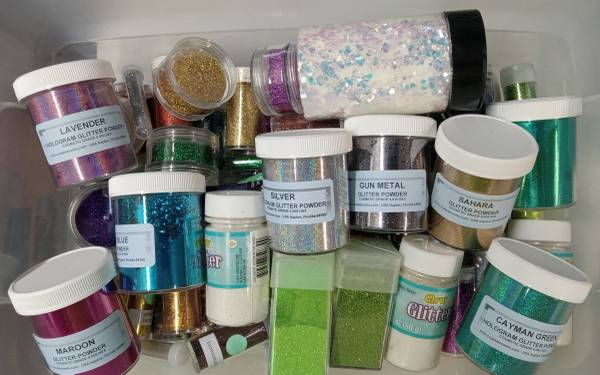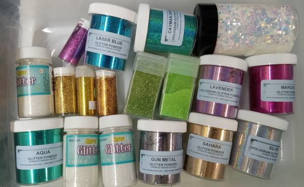 Most of this is super high quality, pro type glitter, some even glows in the dark. Value is over $100. As you can see, most of the containers are nearly full. Note that the fat containers never did have a lot in them, they are not as full as they look because the glitter is so fine it coats the inside of the container. They were sold by weight of the glitter and are cosmetic grade, but there is a good bit in each of them, and some were never used at all.