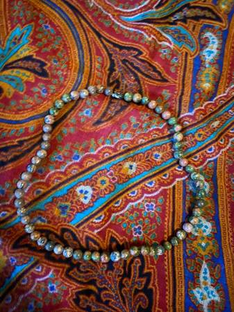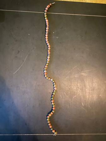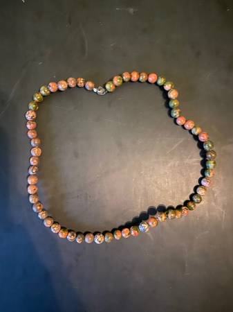 This is a Brown Beaded Necklace. The Necklace is 20l x .25w x .25h. The brown beads have green, brown and pink and silver clasp. Name: Brown Beaded Necklace Medium: Beads and Wire Size: 20l x .25w x...