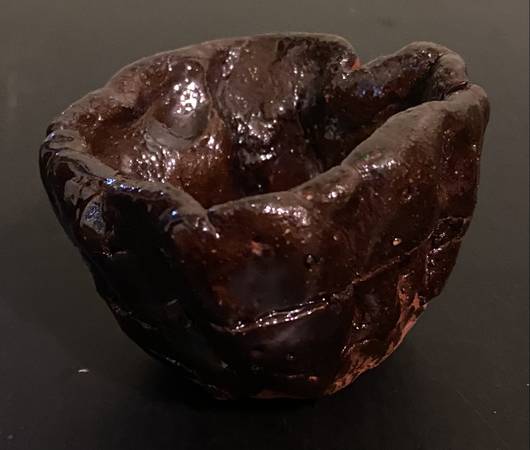 This is called a hand made brown glazed small or mini clay pot. This is handmade and fired in a kiln and then glazed with brown glaze. This was made during my childhood in school. The size of the clay ceramic pot is two inches length, by one inch wide, and three inches high. 2l x 1w x 3h.