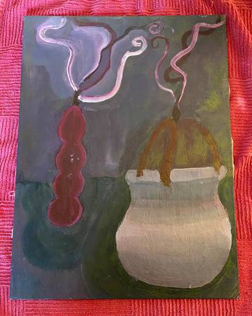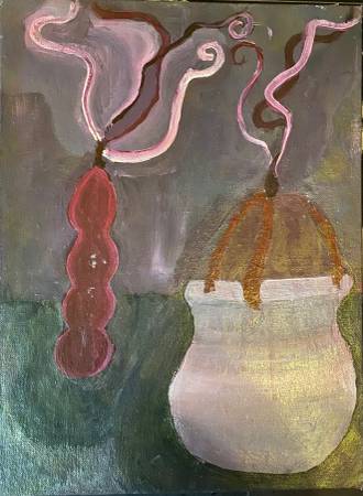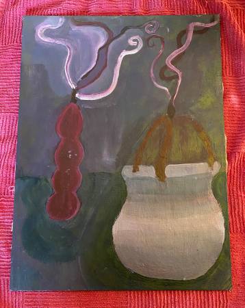 This was painted when I was young and is one of my earlier paintings before I made more still life's and artworks. This is interesting to compare to my current artwork and look at my skills in comparison. This is different and an interesting painting because the smoke swirls from the pot and candle go in the opposite directions with a beautiful purple color in the painting.