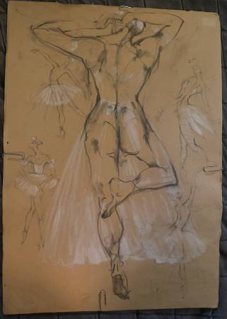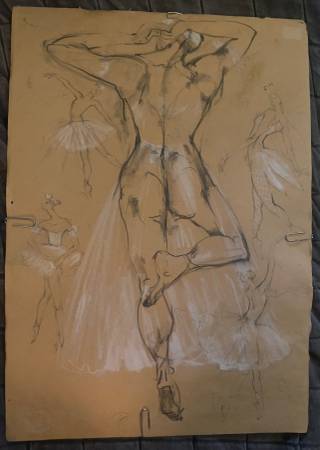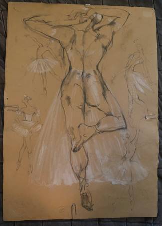 This is a drawing of a dancer on paper made by artist named Jo Popovich. The picture is a sketch of dancer from behind of them dancing with four ballerinas in the background in long tutus.