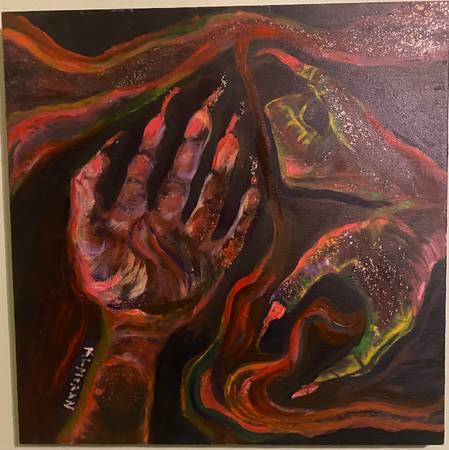 This is an acrylic painting of Glittery, Glimmery, Glitzy, and Sparkly Mirrored Witch Hands and Red Nails. The finger nails are long and painted with glitter. The glitter was mixed through out the painting to make it looks sparkly in different areas in the painting and in the hands, finger nails, and smoke.
