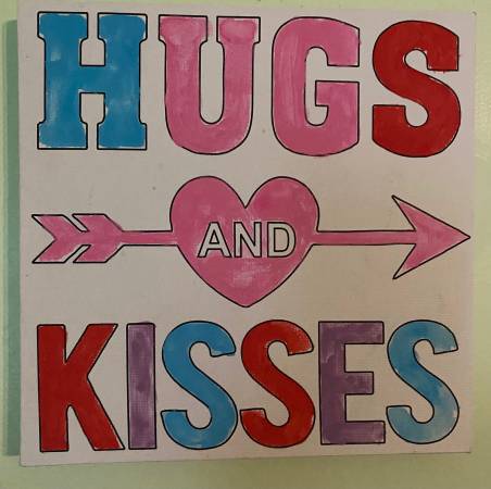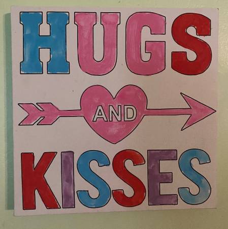 This is a painting is called Hugs and Kisses. The letters are pink, red and blue and the heart had an arrow going through the pink colored heart. I painted all the colors in the letters with acrylic paint.