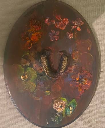 This painting is interesting because it used a dental teeth mold in the center with pressed flowers around it to show that teeth and flowers. The flowers bring out the colors of the teeth on the mold showing how pearly and sensitive and enameled covered they look. The purple and gold on the dental mold matches the purple and dark green and light colored flowers.
