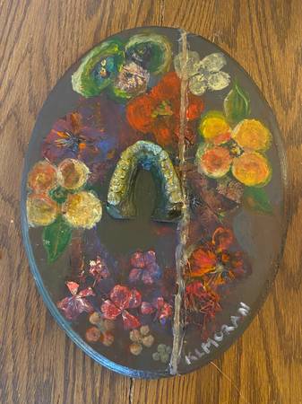This is an acrylic painting with pressed flowers and a teeth mold in the center of the wood. This Gold and Purple Teeth with Dried and Painted Pansy Flowers on a purple oval wood canvas. The painting mostly has pressed flowers of pansies, but had a couple other flowers pressed on the wood and glued.