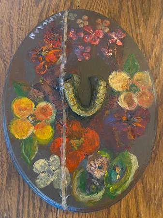 The painting has red, pink, yellow, purple, red, green, gold colors in the painting. The dried flowers are real and there are painted flowers next to the pressed flowers. The pressed flowers are mostly all pansies and were pressed and then glued and then painted over with acrylic paint.