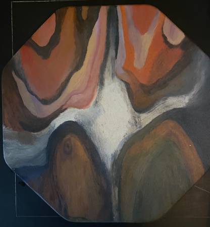 This painting is called Red and Orange Sand Swirl and is painted with colors of red, orange, blue, yellow, brown, and white on an octagon shape wood board. It is a swirl of colors or painted with the wood layers. It represents a layer of sand or sediment underneath or above the ground in painted in bright colors. This is a painting on wood that could be leaned against the wall and put on an easel. This is a design of sand or sediment layers on wood.