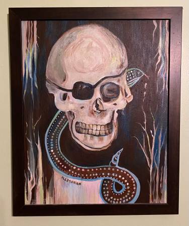 The colors in this painting are red, blue, yellow, brown, white and black. The painting has a skull head with a black patch, a snake, and trees painted on the canvas. The black eye patch is on his right eye of his head.
