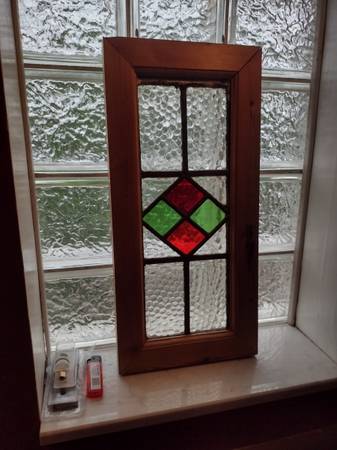 Beautiful vintage 3 piece set of red and green diamonds leaded bubble stained glass for sale. Large piece measures 19" wide x 21" tall and the 2 smaller pieces measure 19" x 9". Call Mike Penn Hills show contact info