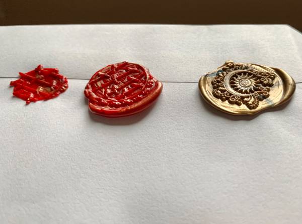 The wooden spoon has never been used, and the only time I have ever used the seals was for the example photos of how the wax seals will turn out. I used 3 wax beads for the last 2 seals, and I used what was left in (my personal) spoon for the first wax seal.