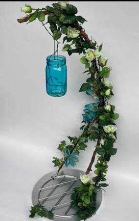 Centerpieces have black metal frames and round matt silver bases decorated with trailing brown vines and white, teal blue, tiffany blue, and yellow flowers. Flowers are mixed, including roses, lilies and wisteria. Graceful dramatic arc rises 34" above tabletop. Thin profile doesnt block conversation. Base is 14" in diameter. Mini white lights trail up from base and fill decorative blue hanging mason jars with a special sparkle. Each one is a unique variation on a theme. Buy one or all. 18 available. (Price is each). Created by a professional artist