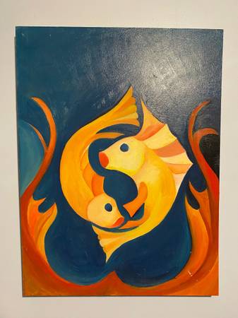 This bright oil painting on wood panel canvas is called Yellow Coy Fish. This is a painting of two coy fish which are orange and yellow with a blue background and a bright orange and red wave. The Coy Fish and Wave are centered in the middle of the painting and the waves are on bottom of the painting. The background of the painting is a medium blue color.