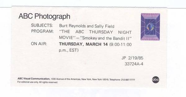 Burt Reynolds 1985 Smokey And The Bandit II Original Photo. Shows Burt Reynolds and Sally Field. 7x9 inches in size. EXCELLENT condition. $10.00