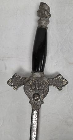 The vintage Knights of Columbus ceremonial sword with scabbard bears the inscription "TC GLEASON CHICAGO IL," indicating its historical significance and connection to the Knights of Columbus organization. Made in the United States, this unique piece is a must-have for collectors and enthusiasts of fraternal organizations. The intricate design and craftsmanship of the sword reflect the values and traditions of the Knights of Columbus, making it a valuable addition to any historical memorabilia collection.