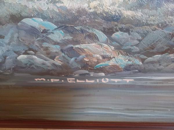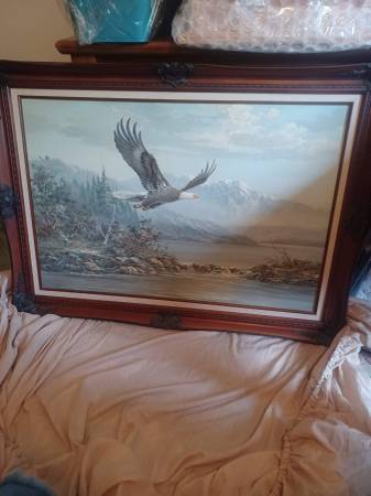 M. P. Elliott, Soaring Eagle Vintage Canvas Oil Painting, 42" wide, 30" high, beautiful painting and frame, signed, no flaws, excellent condition. In person, cash deal only.