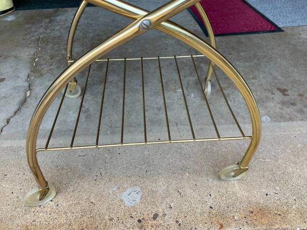 Mid Century Serving / Bar Cart. Gold Tone. Very clean for its age as shown. Top Tray = 20 x 16 inches Height to Handle = 31 inches $30 Cash. No Cash Apps.