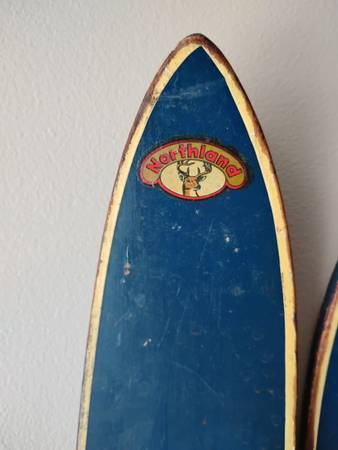 Pair of vintage Northland wood skis, made in USA, circa 1950s. Original blue finish with aged white trim, original decals ("Junior" and "Nordland"), and classic leather strap bindings; beautiful read bottom paint. Approx 65". Color, patina and style - Great for cabin decor or collectors. These will look GREAT hung in your ski chalet, cabin, condo or home.