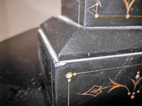 Antique European 3 piece black slate clock set. Garnitures are 8.5” tall and the top round piece is 5 ¼” in diameter. The bases are 4 ½” wide by 3 ½” deep. The clock is 10 5/8” tall x 12 ¾” wide, 4 ¾” deep. Has Pendulum and key. Does not work – overwound. Some small chips in the marble but nothing too distracting. The glass face is intact. There is some fading to the slate on the sides of the garnitures. The face of the clock is 4 ¾” in diameter. Asking $375, cash only, door pick up in North Huntingdon, PA (south by Rillton, PA).