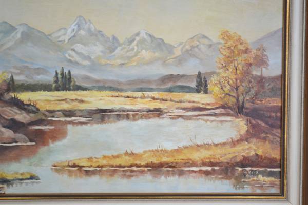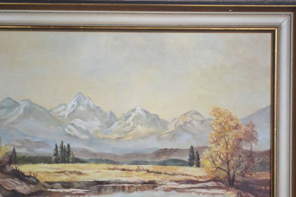 Vintage alpine landscape oil painting artwork on board. Framed and signed G. Mang, 1968 lower right. The frame is 22 ¾” x 31 ¾”, and the painting is 19” x 27 ¼”. The frame has some minor scuffs with some plaster missing and the painting is secured with duct tape. No issues with the painting. Acquired in Germany between 2012 - 2015 when we were stationed there.
