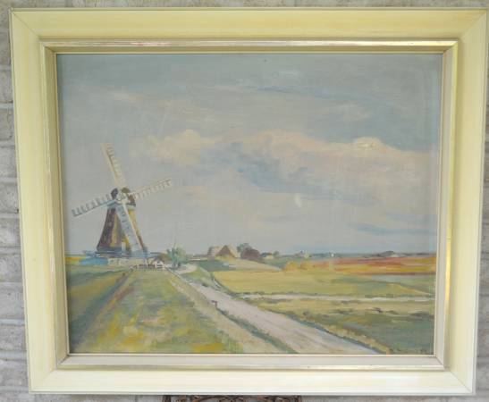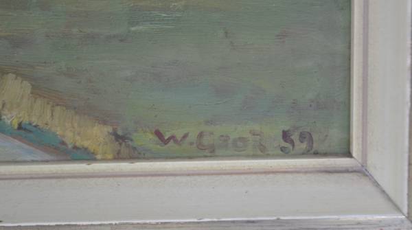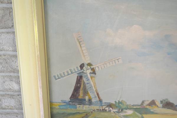 Vintage oil painting on board of a Dutch landscape with a windmill. It is signed lower left and looks like W. Grob or Groth, '59. Frame is 27 1/2" x 32 1/4" and the image size is 22" x 27". There is something written on the back but it is too faint to read.