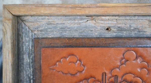 Vintage tooled leather picture of the Spoetzl Brewery (Shiner Bock) in Texas by Eddie Montemayor. It is framed in rustic wood. The frame is 13 x 15" and the leather piece is 8 1/2" x 11". Signed lower right.