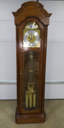 Ridgeway grandfather clock, beveled glass, cable drive, moon dial, 3 chime and silent mode, like new, $500 obo.