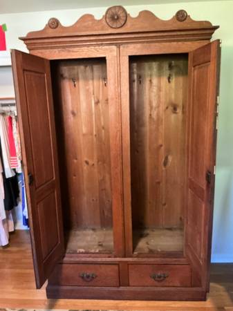 Beautiful antique oak armoire, great original finish, 2 doors, 2 drawers, 90” H x 40” W x 20” D, can be disassembled for moving. $495.00 cash only.