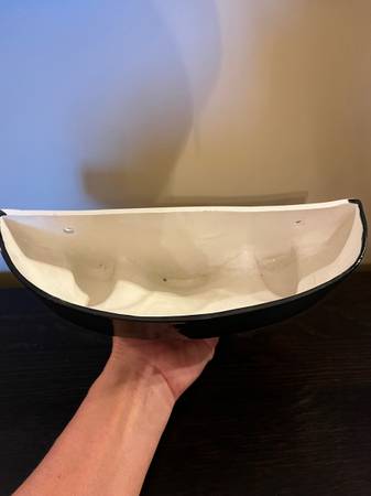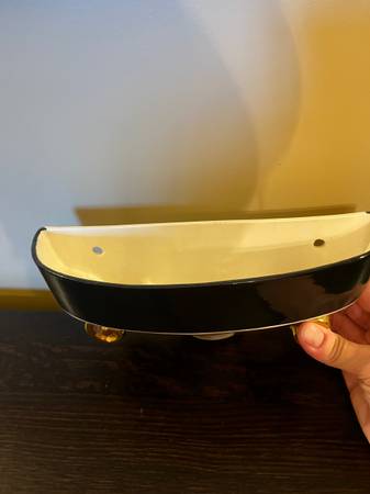 Gorgeous porcelain wall pocket with a black upper section, a creamy white base with gold scrollwork accents, Hollywood Regency, deco