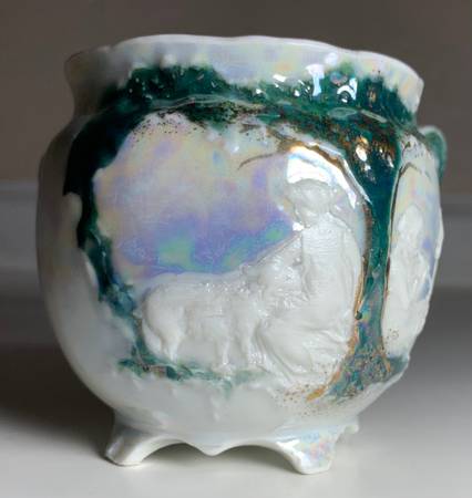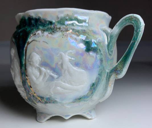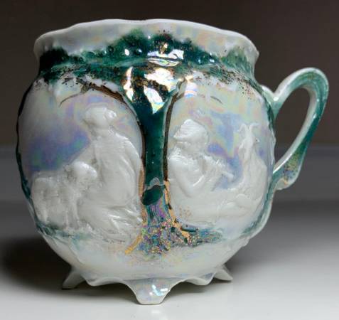 This gorgeous teacup has a small chip! Please wash it carefully (if you use it). The teacup seems thin and lightweight. I received another opinion that the characters look like Greek gods, and how this is a Greek style of teacup. Regardless of the exact them, the large, protective trees and the peaceful setting created by the people and animals communicate a tranquil vibe.