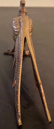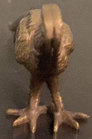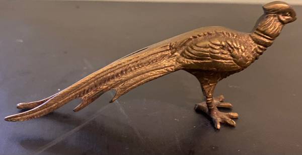 This is a Brass Long Tailed Bird or Pheasant. It has to long tail feathers and a two claws and a head with a feather on it's head. The head looks like a long curved feather on top of it's head. The feet are webbed and separated in the front and attached in the back. There are two wings and two long tails that extend back two and a half inches long.