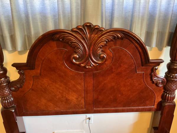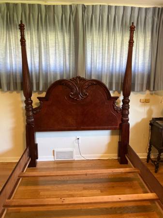 Beautiful mahogany poster bed, queen size, unique poster bed construction allows you to remove the top portion of all 4 posts should you wish to lower the overall height of the pillars. Pristine condition with wonderful carving and great finish,62 W x 90 L x 84 H (height is 42 with upper posts removed). $500.00 cash only