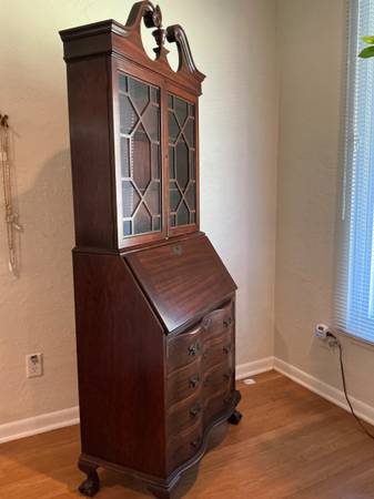 Beautiful vintage secretary made by MADDOX TABLES, Jamestown, NY, 4 drawers, 2 doors, 2 shelves, original brass hardware, 17” D x 31” W x 78” H, $495.00 cash only