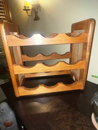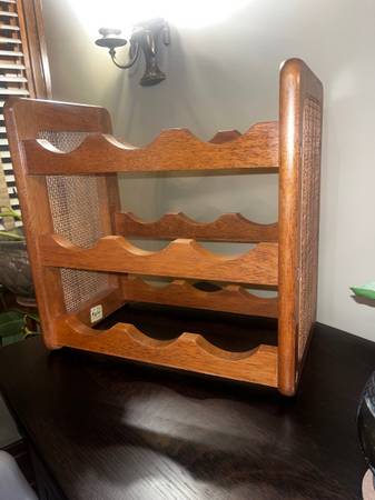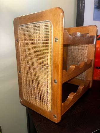 Great robust counter top wine rack, holds up to 9 bottles Nice boho 70’s style made from oak I believe, labeled made in Taiwan Approximately 15” wide x 14.6” tall x 8.8” deep Nice used condition...