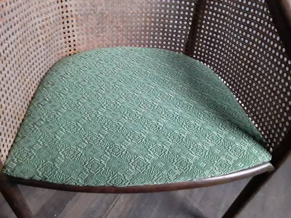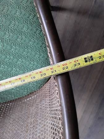 Very solid and sturdy classic rattan chair with all the cane back webbing fully intact on it . A very nice vintage chair that's in great shape for its age . It measures 22 inches in width , 24 inches in depth and is overall 32 inches in height . The seat top height is 17 1/2 inches from the floor . The upholstered seat top could be reupholstered if someone chose to do that in a different color , but there's no rips , tears or odors in the fabric seat on it and it looks great . It's been sitting in storage for quite a while and needs to find a new home .