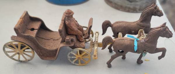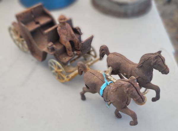 Crafted in the 1940s from cast iron, this piece is a true treasure for collectors of vintage toys. Rusted & missing paint. Missing the lady, Canopy and frame of canopy.
