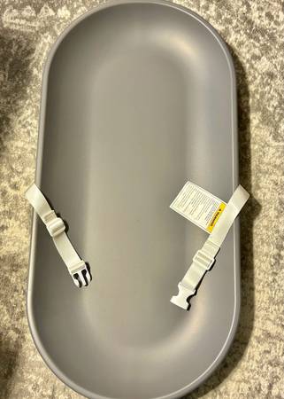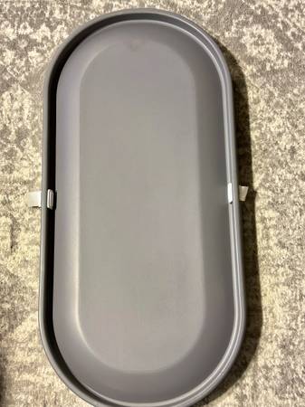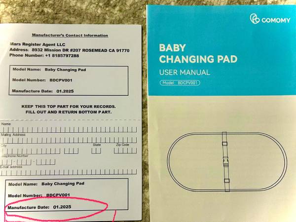 This is a brand new Comomy grey baby changing pad with a safety belt and anti-roll contour. It is waterproof and portable. It was manufactured January 2025. The list price on Amazon is $69.99.