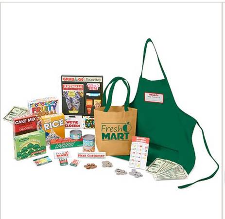 Perfect for Christmas! Melissa and Doug grocery store with moving belt, cash register and accessories including groceries to fill the shelves and a grocery bag. Hours of fun!!
