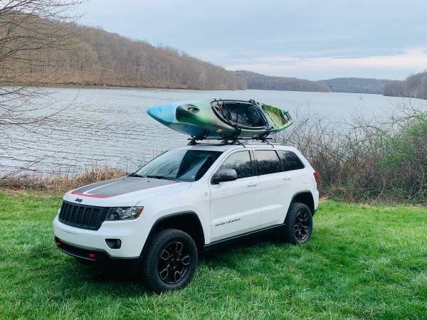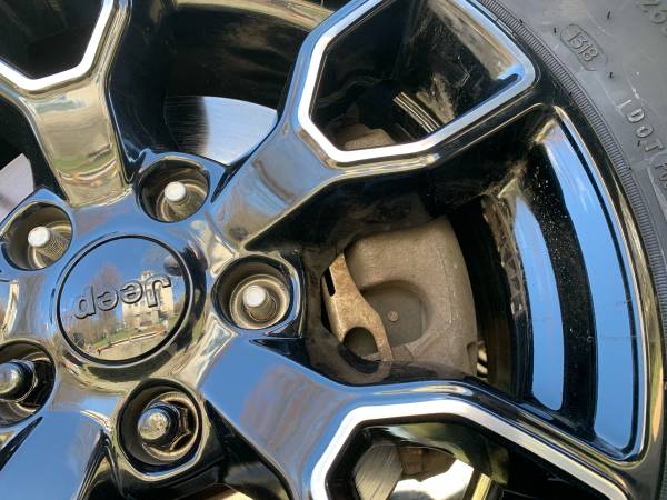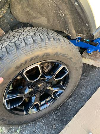 Set of 5 jeep wheels with tires on 4. Tires are half tread. They came off a jeep wrangler Smokey mountain edition. I had them mounted on our jeep grand Cherokee trail hawk 2013. In great shape. Just dirty from sitting in basement. Sold jeep. No longer need.