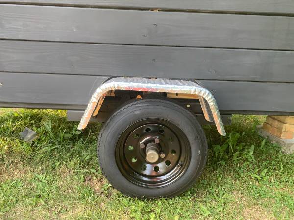This is a 1800lbs trailer. It has 2 layers of plywood on floor. New tires. With spare. Has bearing buddies freshly greased. The wheels are actually refinished and shiny black. They are just dirty.