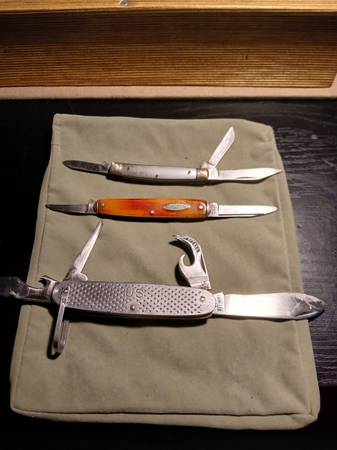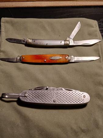 Lot of 3 vintage knives Pear handel 1960,s sabre japan 3 blade Burnt orange desirable 2 blade 1920,s utica 1958 Vietnam us military pocket knife. Looking for descent sounding pair of yamaha speakers...