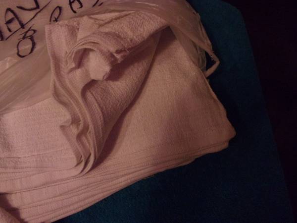 HUGE LOT OF 15 X 16 COTTON "BAR" TOWELS (480 COUNT) THESE ARE NEW TOWELS HAVE 8 PACKS OF 60 TOWELS EACH IN SEALED BAGS AS DELIVERED ASKING $40.00 PER BAG WILL DISCOUNT FROM THAT FOR THE WHOLE LOT OF...