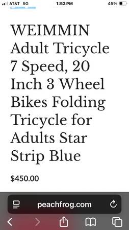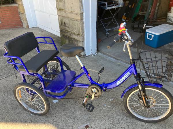 Available 3 wheel folding swimming bike WTH rear passenger seat and basket $300 or best offer Great condition