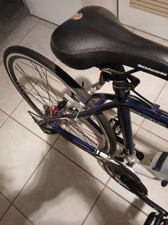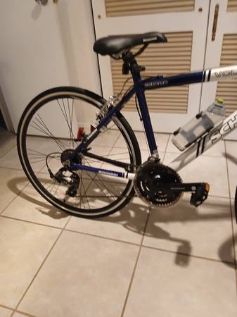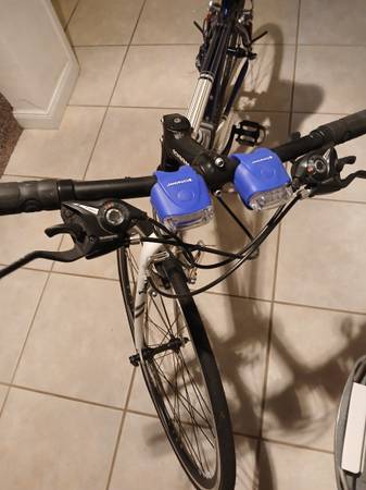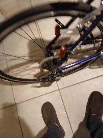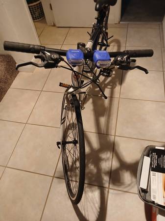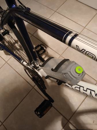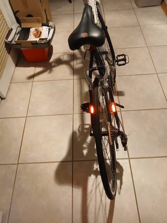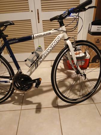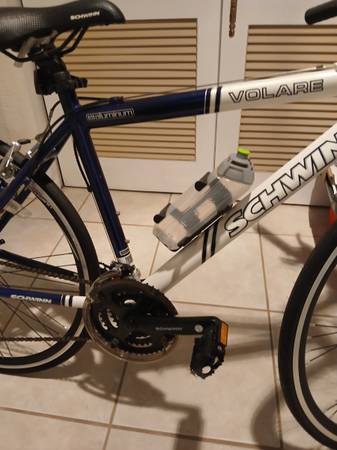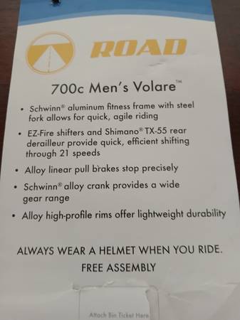 This bike is a 700c men's Volare. It is aluminum with steel fork which allows for quick agile riding. It has EZ- Fire shifters and a Shimano TX-rear derailleur that provides quick efficient shifting through 21 speeds, it has alloy linear pull brakes to stop precisely. Schwinn alloy crank provides a wide gear range. It has alloy high profile rims that offer lightweight durability. The bike has front and rear lights and a mounted water bottle. If you are interested just text or call me at show contact info