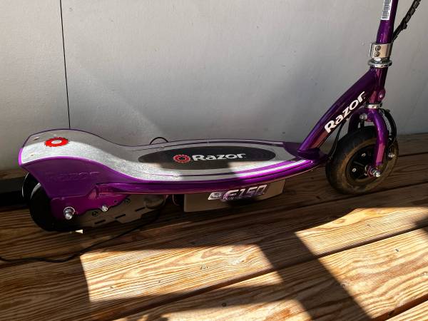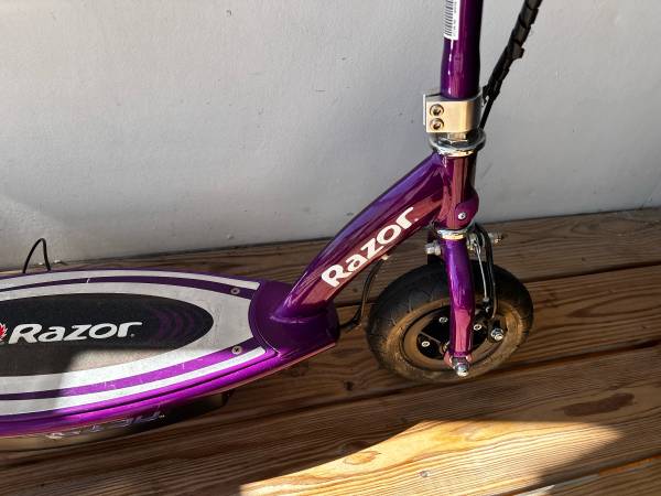 Grab this great condition, metallic purple Razor E100 Electric Scooter for a steal! This scooter is in excellent cosmetic shape and is ready to zoom—it just needs one easy replacement part.